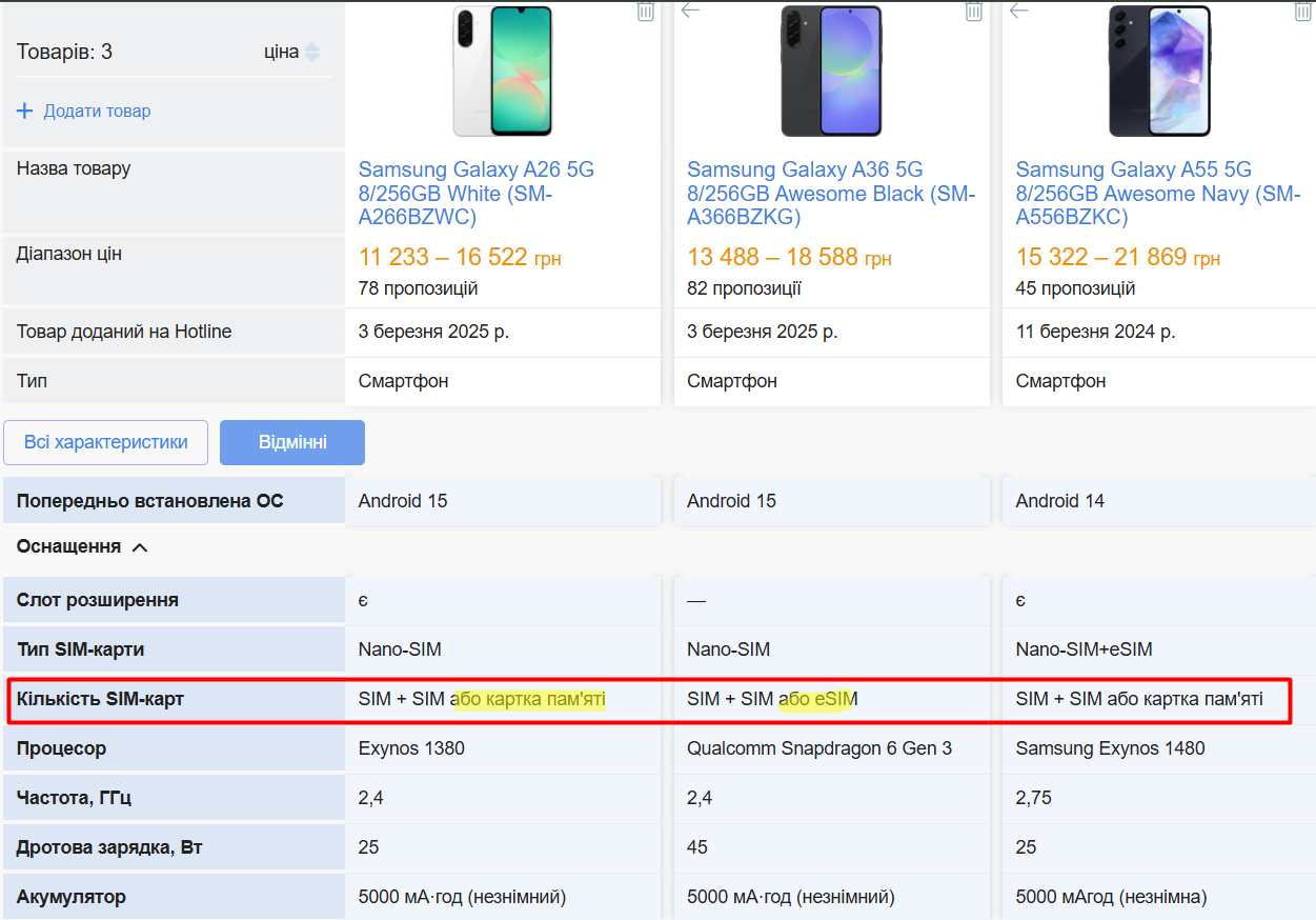 Ну як зрівнянвся. А55 8/256 на 3,5 тис дорожчий за А36 з такою ж пам'яттю і майже на 6 тис. дорожчий за А26. І А55 також на ексіносі.