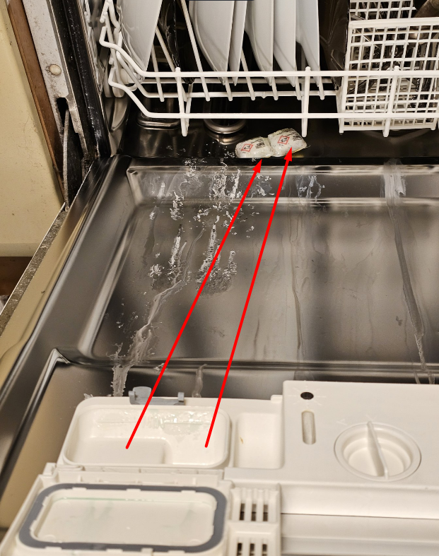 Я завжди кладу миюче під лоток для посуду. Бо щось подібне теж було , і залежить від того як посуд напханий