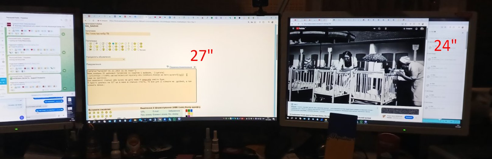 А шо його шукати? інше не критично. Для невеликої спальні або кухні на дачі може й оверсайз навіть буде. Я просто дивлюсь на 32" що в мами в спальні стоїть, то він для її кімнати не дрібний, а там кімната менша. Ліниво тягти 32" для порівняння але от фото моніторів 24" - діагональ 60см, 27" - 70см. У 32" - 80см. В мене на кухні 24" (чи навіть 22) Сатурн. Вистачає, хоча кухня помітно більша ніж на дачі.