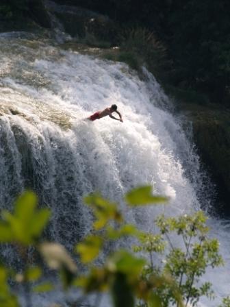 То, что ты въехал на территорию Хорватии, становится сразу понятно – просят оплатить проезд по автобану в кунах (но если их нету – то можно и в евро, никто не осудит ). За час буквально добираемся до Карловаца, еще часик – и мы на Плитвицких озерах. Тут мы уже знали куда едем – еще утром получили смс-ку от Максима (он же Totti), с которым познакомились в Интернете в процессе обсуждения плана поездки (на Форуме любителей Хорватии). Он снял апартаменты в Раковице (11 км до озер), судя по описанию – вполне приличные, цена (30 евро) тоже вполне устраивает. Просим забронировать номер и для нас, и по приезду спокойно вселяемся в весьма приличные апартаменты с хорошей ванной (что для Вероники – просто рай, особенно после аквапарка – понравилось ляпаться в теплой воде). Хозяйка – Марьяна, сразу вызывает наше расположение, разрешив постирать вещи в своей стиральной машине, угощает чаем и кофе – очень приятная женщина. Кухня в доме общая, но весьма просторная, плюс – дом построен год назад, мебель и техника новые. Еще один плюс – дом стоит не прямо возле дороги (довольно шумной), а метрах в 30 от нее, поэтому шумовых помех от проезжающих машин практически не наблюдается. Наш номер на первом этаже с небольшой терраской, у наших сограждан (Максим, Вера и Ира (последней 7,5 лет, с Вероникой сразу находит общий язык) на втором, и тоже есть где посидеть на свежем воздухе. Но это потом, а пока они исследуют Плитвицкие озера. Для нас же посещение этого заповедника не в новинку, посему неспешно отдыхаем, и примерно в районе 17 входим на территорию озер – на этот раз через Улаз 1. Описывать Плитвицкие озера бесполезно – приезжайте и смотрите, это словами тоже сложно передать. Ну что могут сказать слова «бирюзовая вода»? А когда ты в «режиме реального времени» идешь по берегу, и на тебя из воды исподлобья смотрят огромные рыбины (некоторые сантиметров 50 в длину, и толстые что тот сурок из Ялтинского зоопарка), которые очень хотят кушать (надеюсь, что не туристов )…. А тут еще водопады вокруг…. Все, ни слова больше об озерах. Вход – по-прежнему 110 кун. Вечером знакомимся с киевлянами, пьем прихваченное мной из соседней страны словенское вино, наслаждаемся теплым и свежим воздухом. Рассмешила история ребят о том, как они проходили хорватскую границу (пограничников вообше не было на посту, а таможенники сказали им проезжать, в результате чего Максим с семьей оказались в Хорватии без штампов о въезде в паспортах. Да, та еще бдительность . По своей инициативе Максим пешком вернулся на границу и чуть ли не силой заставил полицая все же зафиксировать их прибытие в страну озер и гор. Утром нас ждет выезд на побережье, у ребят забронированы в Дубровнике апартаменты лишь с 31 августа, посему наши планы заночевать на 3 дня в районе Водице, а потом вместе рулить на Дубровник, идеально совпадают с их пожеланиями.
