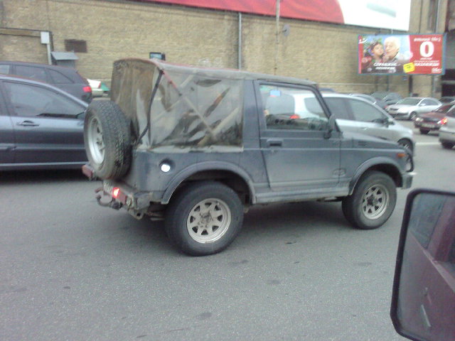 Сегодня встретил на дороге "Сузуки Самурай". То, что у него задние фонари установлены от "Москвича-2140", - это полбеды. Но какой у него верх! Сделан полностью из прозрачной плёнки! Не представляю такой езды. Видно сквозь него всё, от прямых солнечных лучей не защищает, при этом циркуляции воздуха, как под матерчатым, там не будет... Интересно, зачем такое сделали? По идее, езда должна превращаться в мучение
