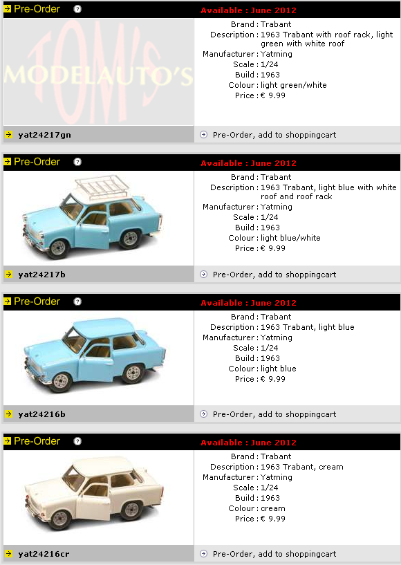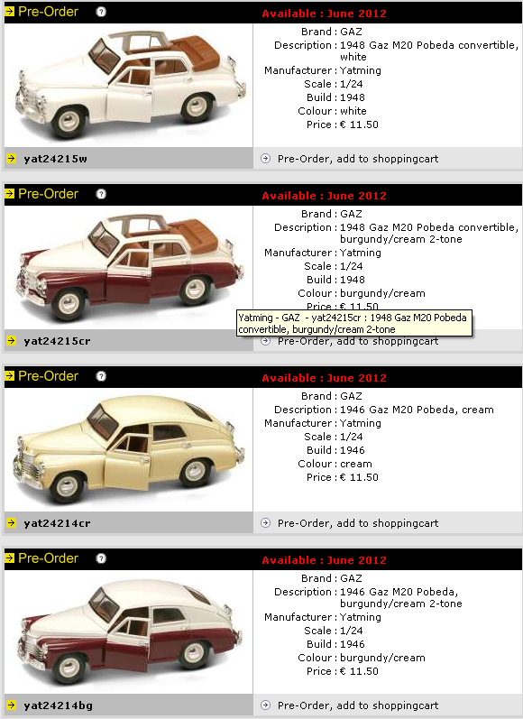Только что знакомый из России прислал мне прелюбопытнейшую ссылочку с новинками от Ят Минг в 24-м масштабе, предлагаемыми под заказ на июнь этого года. http://www.toms.nl/searchresults?nobotco...&zoekwoord= Что скажете, господа? Надо понимать, что ждем-с новинок уже очень скоро? Я бы хотел обе Победы! А Траби с багажником - просто сказка!