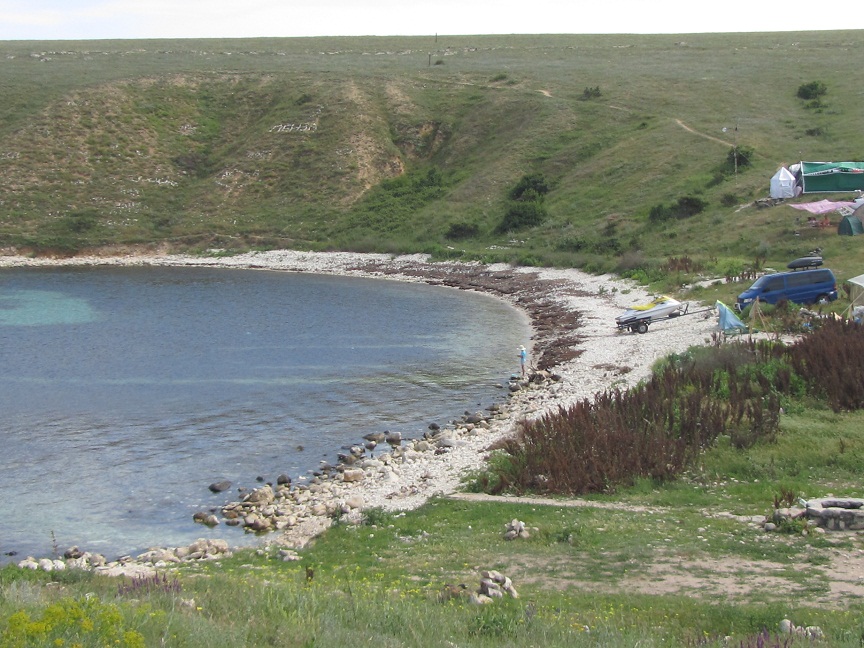 Ну, вот мы и вернулись, после отдыха на Тарханкуте. В теме "Тарханкут. Прошу совет" обещал написать отчёт, но лак всегда, написал не сразу… Но, написал. Ездили -- я, жена, дочь, племянник (обоим по 11 лет) и тесть. Главный, наш с женой, вывод – нужно ехать ещё раз. Не насытились. Что и собираемся сделать в конце июля месяца. Я понял, что отдых, действительно, на любителя. В связи с тем, что один любит арбуз, а другой поросячий хвостик, мнения о «диком» отдыхе в палатках самые разные. Подобный отдых нужно любить, понимать и в некоторых случаях терпеть. И те, кто пишет, : «Фи… Ацтой… туалеты в ямках… вода в канистрах… питание – принеси сам…», просто другой категории люди. Только я не понимаю, зачем они просматривают и пишут отзывы в темах о диком отдыхе… Пусть читают темы – «Отдых на Мальте», или «Качество сервиса в отеле «N». Меня, лично, такие отзывы, когда я перед поездкой собирал информацию, немного поднапрягли. Слава Богу, я другой человек и сумел найти позитив даже в небольших минусах. Мы бывали и в Египте, и в Турции, и в пансионатах в Крыму, и в снимаемом жилье жили в Ялте, Судаке, Симеизе и Севастополе. Поэтому отдых в палатках был выбран не из за экономии, а как что то новенькое и непривычное. Я шерстил до поездки инет в поисках инфы о подобных путешествиях. Было и хорошее. Но, читал и отзывы явно отрицательные… И несмотря ни на что НАМ ПОНРАВИЛОСЬ!!! А, для тех кто экономит, могу сказать, что отдых достаточно экономичный. Мы на пятерых, с топливом, продуктами, подарками родственникам и оплатой небольших удовольствий потратили за 14 дней отдыха 5000 гривен. И половину продуктов привезли обратно. Правда эта сумма без оборудования… (палатки, спальников, матрасов, примусов, всяких стоек и тентов и т.п.). А, можно потратить и того меньше. На, оборудование, конечно, нужно потратится – но, практически, единоразово. Так, что, кому интересно – делюсь полученым опытом и впечатлениями… Итак! Тарханкут, -- это полуостров степного типа, чья территория заселена не очень густо. Посёлки небольшие и некоторые выглядят очень небогато. Незнаю как живётся местному населению, но туристами Тарханкут не обижен, хотя плотность туристической массы гораздо ниже чем на ЮБК. Курортная зона начинается где то от посёлка Межводное. В Межводном пляжи песчаные и пологие. Мы остановились на пять минут и немного побродили вдоль моря. Не очень понравилось, что берег по кромке воды в сухих и гниющих водорослях. Запах моря смешивается с запахом этих водорослей и «амбрэ» получается своеобразное. Тем не менее отдыхающих много, а вдоль побережья на протяжении нашего пути – палатки, палатки, палатки… Но, наша цель – Тарханкут холмистый и настоящий и мы едем дальше. В Черноморском особо не приглядывались и поехали на Красносельское. Ещё будучи в Киеве я собрал информацию о палаточном отдыхе на Тарханкуте и остановился на месте которое называется Большой Кастель. Это бухта в которой есть свой колодец с пресной водой, что при выборе сыграло определяющую роль. Дома я, используя спутниковую карту, занёс в автонавигатор точки по которым можно добраться до Большого Кастеля по грунтовкам и проехав Красносельское мы, возле самого въезда в село Оленевка, свернули вправо на грунтовку, придерживаясь навигационных точек. При подъезде к побережью пришлось преодолеть парочку подъёмов и спусков проблем