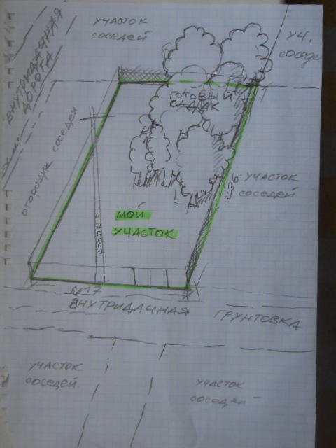 Теперь так, участок ровный, прямоугольный где то 17.5х36м (6 соток) по периметру. Вот примерная схема расположения участка, соседей, электрики (столб) и садика на участке.
