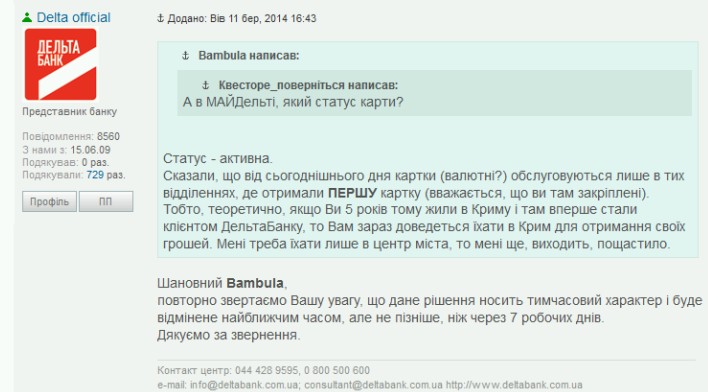 +1 держу несколько гривневых и валютных депо в Дельте, есть кредитка от них-же, все работает. Одно время Приватбанк кредитными средствами вообще запретил пользоваться, затем 200 гривен в сутки, сейчас- 800. Дельта таких запретов не вводила, вчера рассчитался на 1900 гривен кредиткой Дельты без вопросов.
