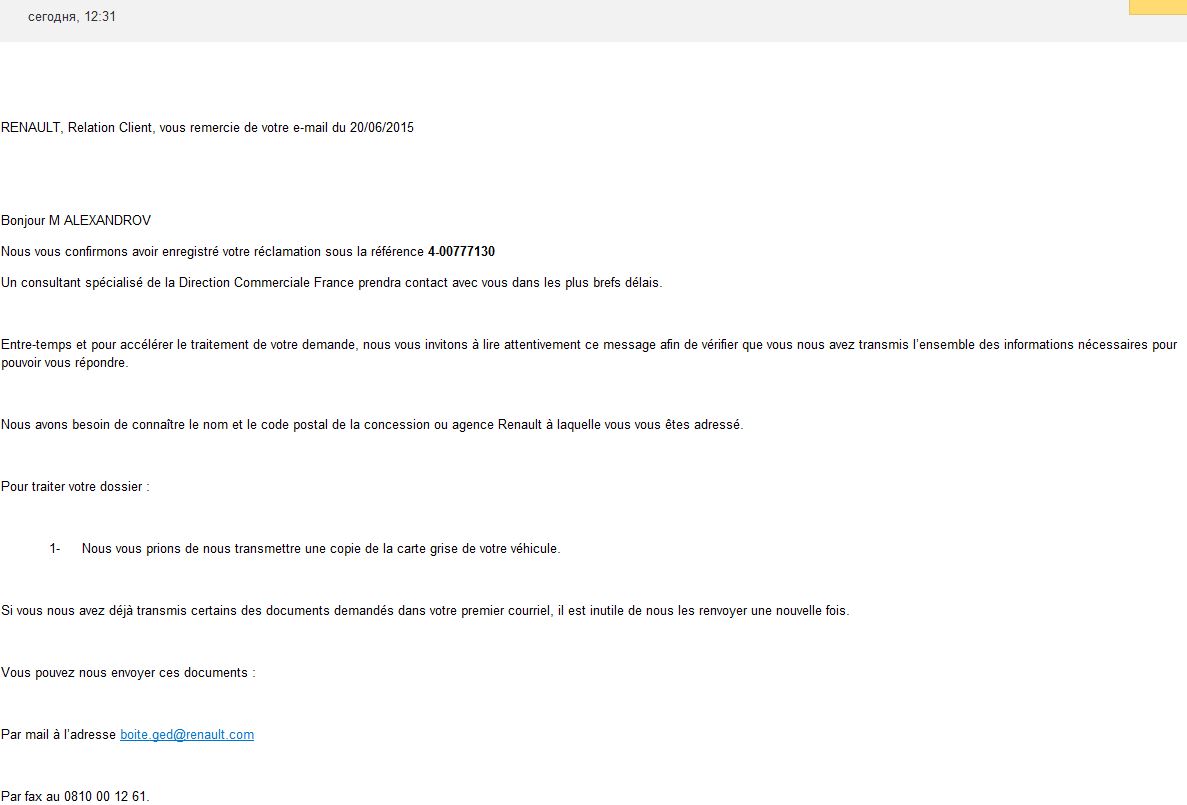 Радует, что получил ответ с зарегистрированным номером претензии. Хоть и робот ответил, но теперь хоть видно, что жалоба зарегистрирована. Не так как в "Рено Украина" - шлите письма хоть до конца века без реакции.