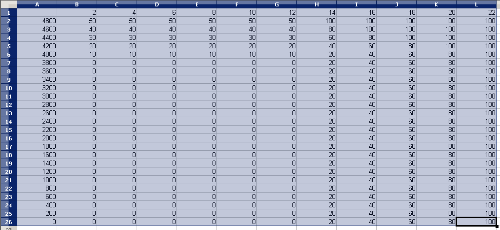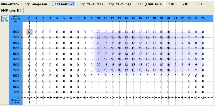 Вот изображение окна доли бензина настроечной проги стага. Цитата из мануала по вопросу: "Значения карты представляют процентную долю бензина во время движения на газе в данном пункте работы. Реальное время повторного впрыска бензина равно отношению значения на карте к времени впрыска бензина в данном пункте работы. Например, 20% для колонки 10 мс означает, что повторный впрыск бензина равен 2 мс. ! После модификации карты доли бензина следует проверить правильность состава смеси в областях, где разрешен повторный впрыск бензина."